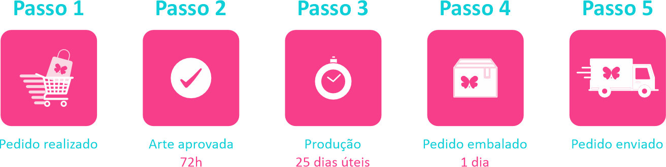 1. Prazo de produção: 25 dias úteis, após a confirmação do pagamento.
